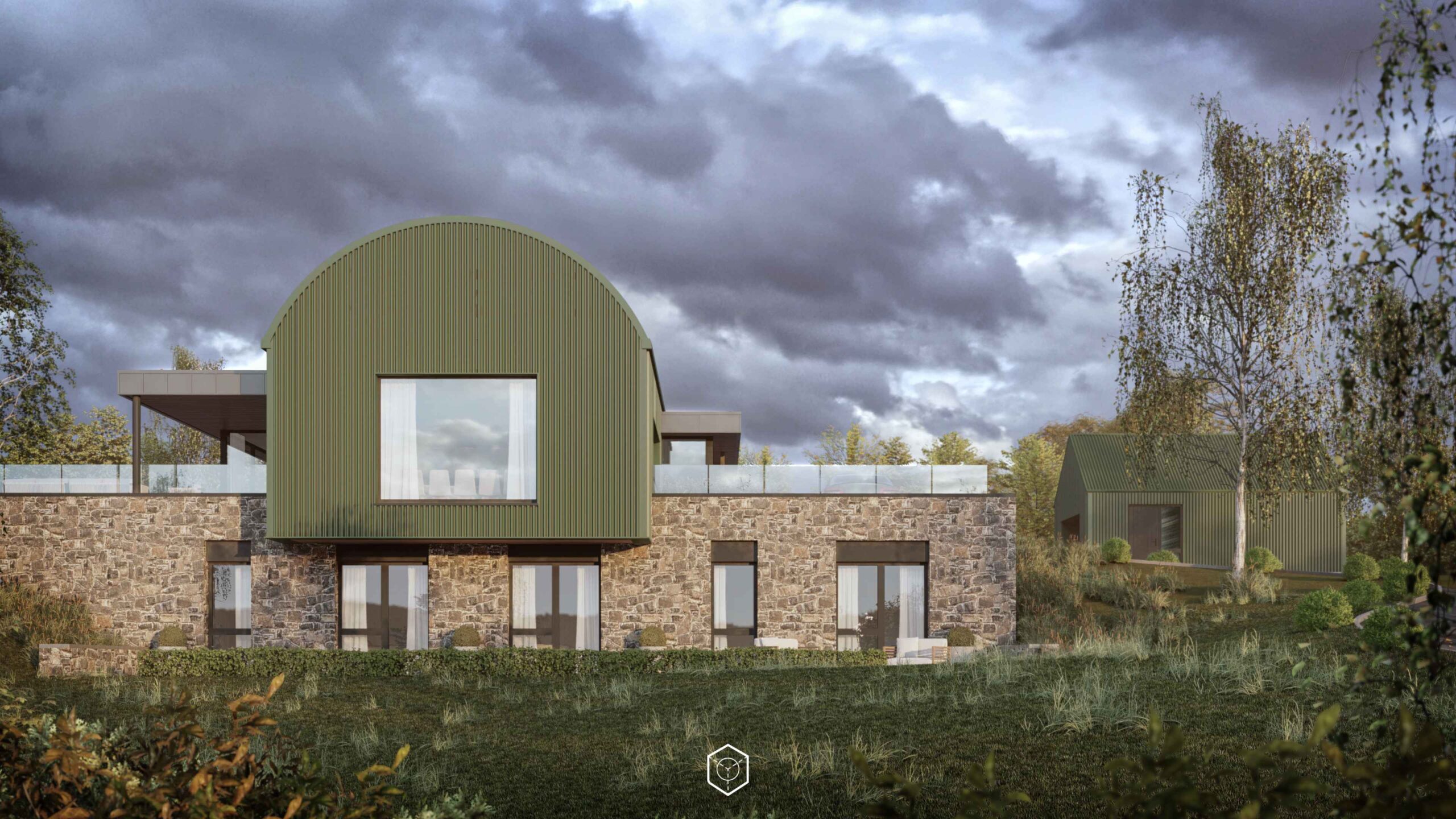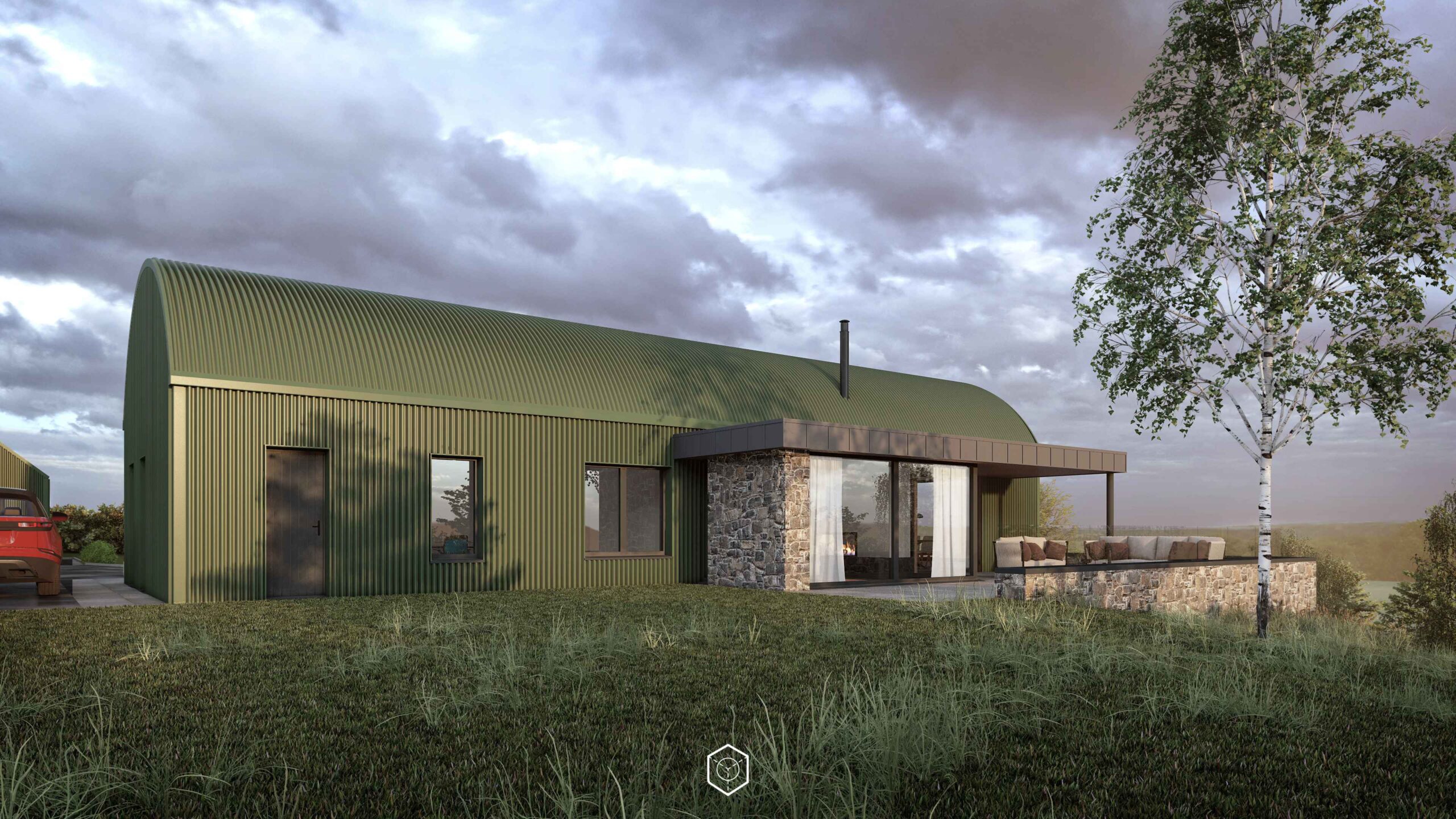 A contemporary new build dwelling approved for a sloping site in rural County Longford, the design encapsulates traditional agricultural forms and materials.  It features a barrel roof and corrugated metal cladding, with a natural stone plinth to the lower ground that anchors the dwelling into its context.