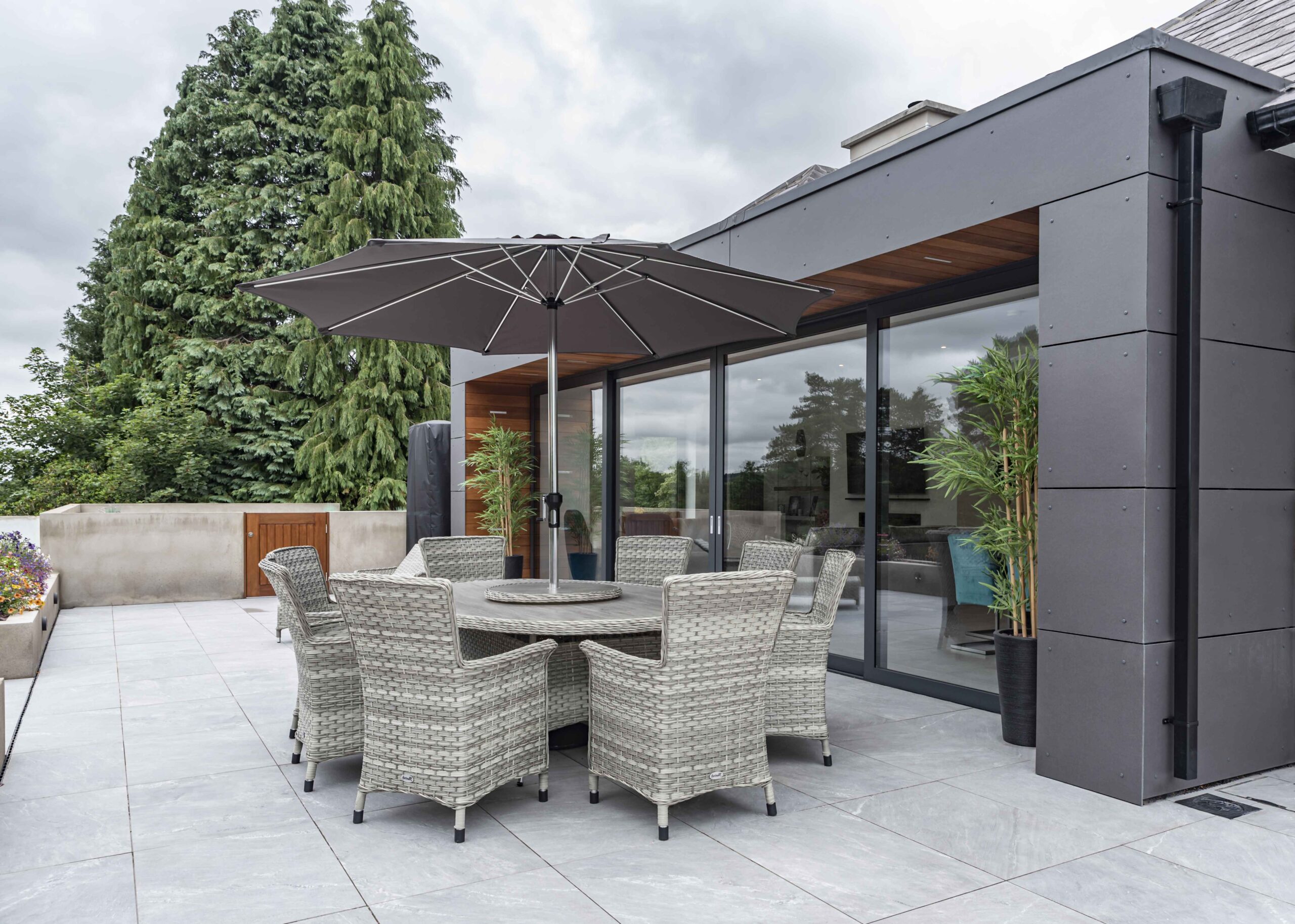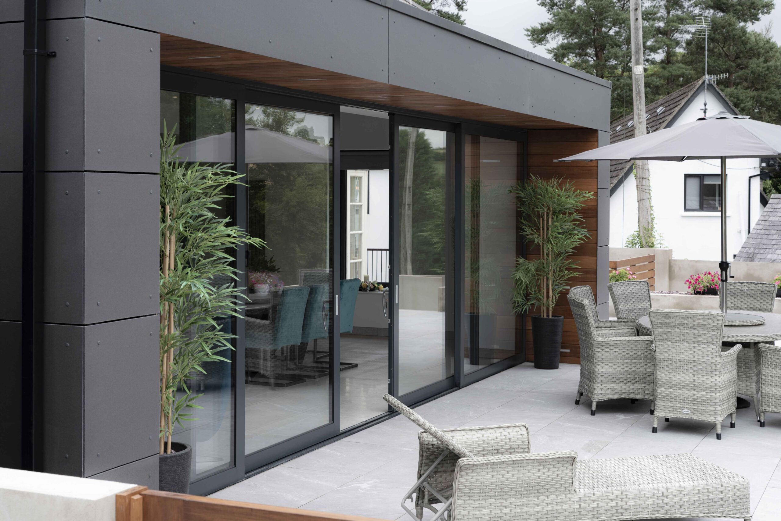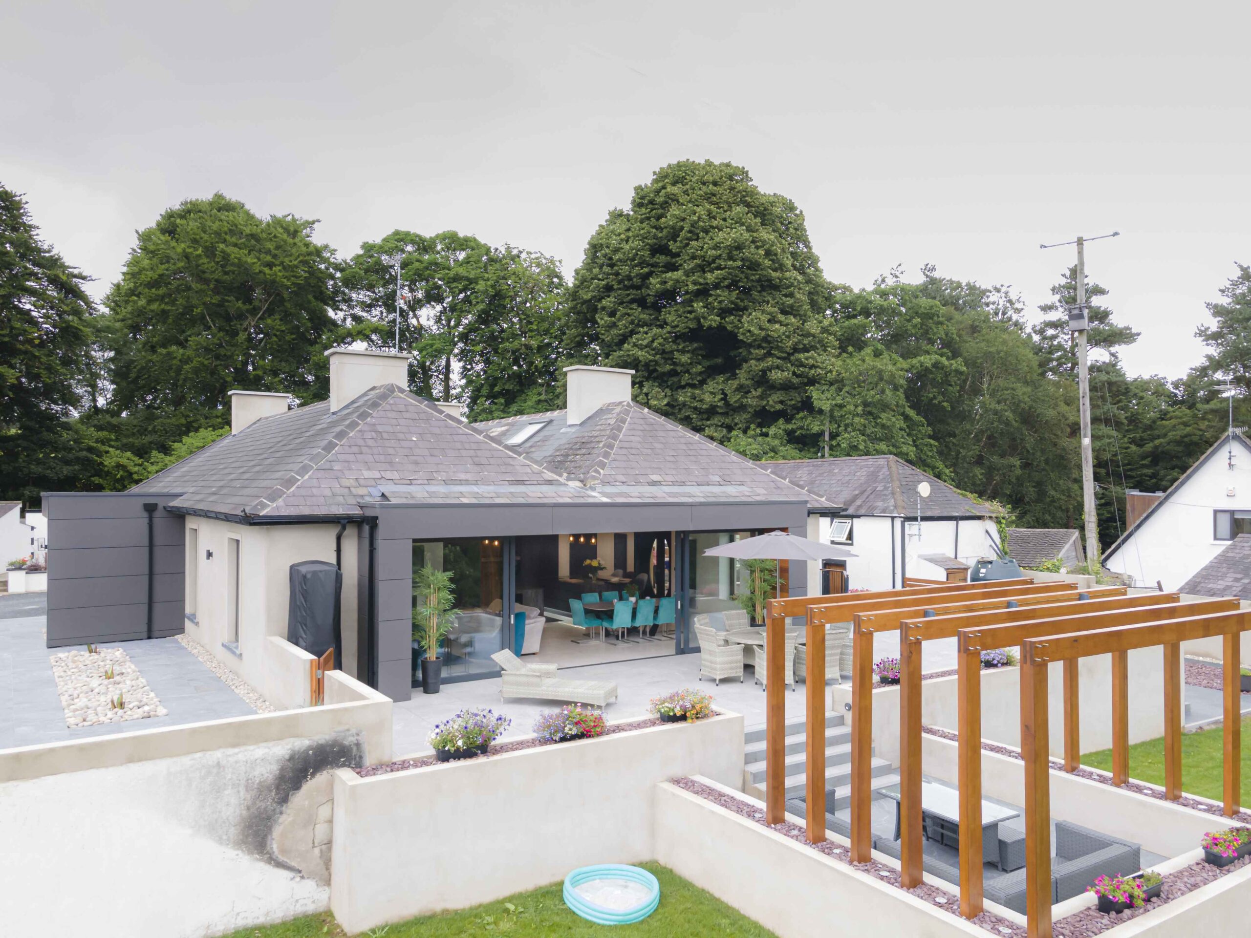 Adjacent to the new south facing living area, a new two-tiered patio area was created to allow the interior spaces to seamlessly flow outdoors. Featuring planter walls, porcelain tiling and a sunken seated area with oak pergola structure, the outdoor areas became an extension of the family home.